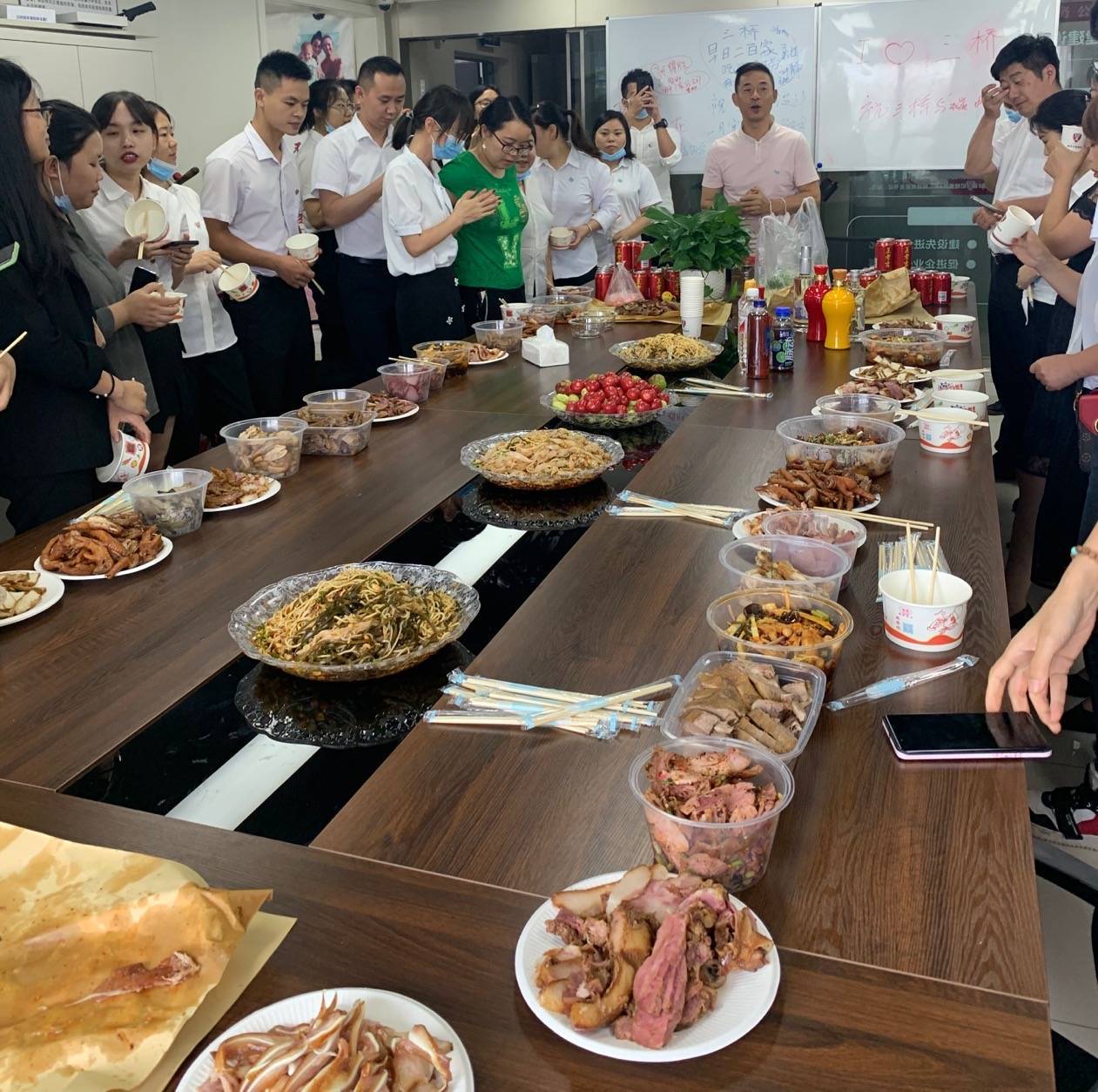 七月十六日中午,为了庆祝我们资质的下证,也为了让整个集团感受到我们三桥的气势与自信心,我们三桥设计院特别组织安排了“冷餐一夏”的聚餐活动,我们准备了各式各样的美食,有卤菜,有水果,有饮料,让大家在这个夏天感受清凉,吃个痛快。